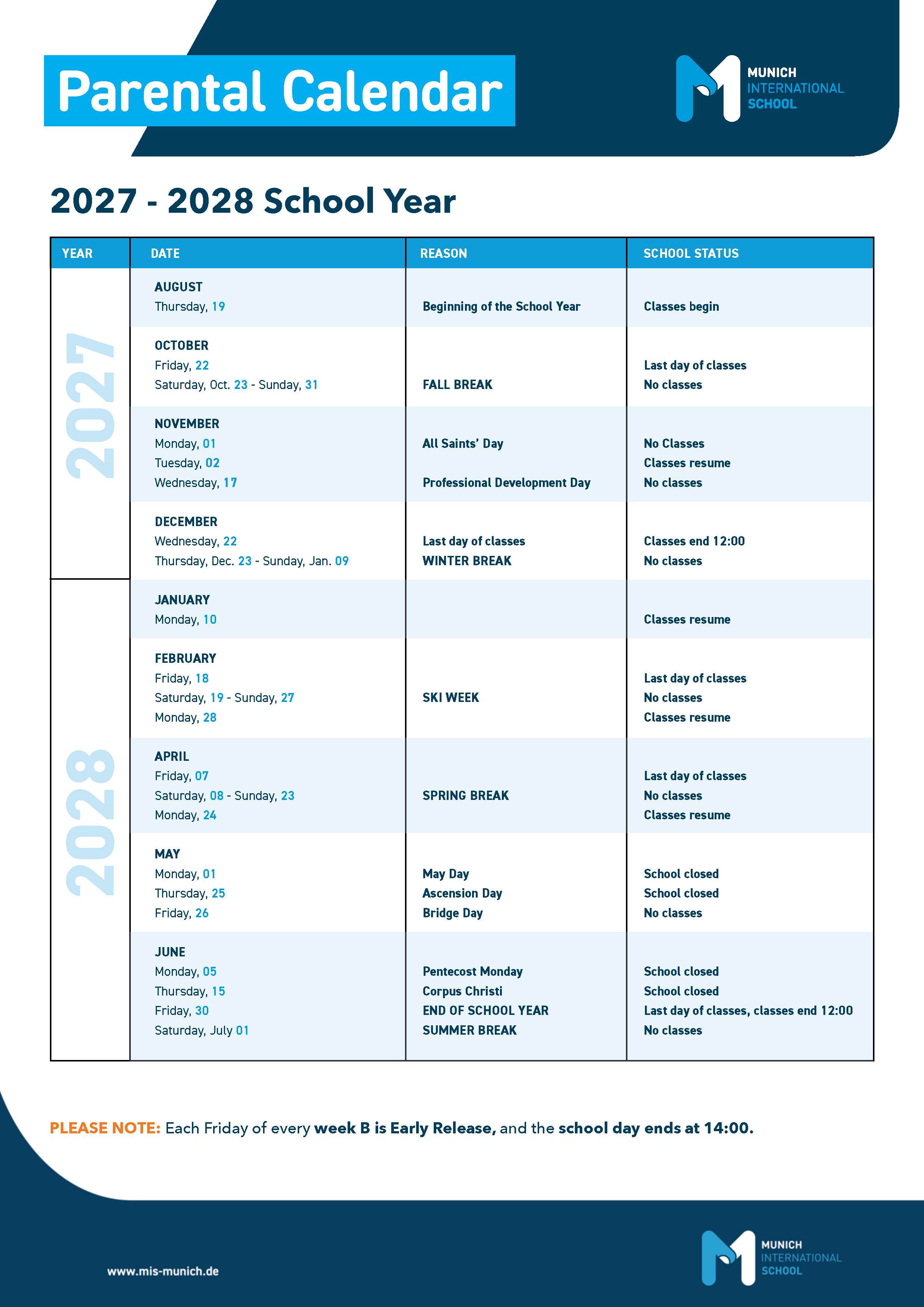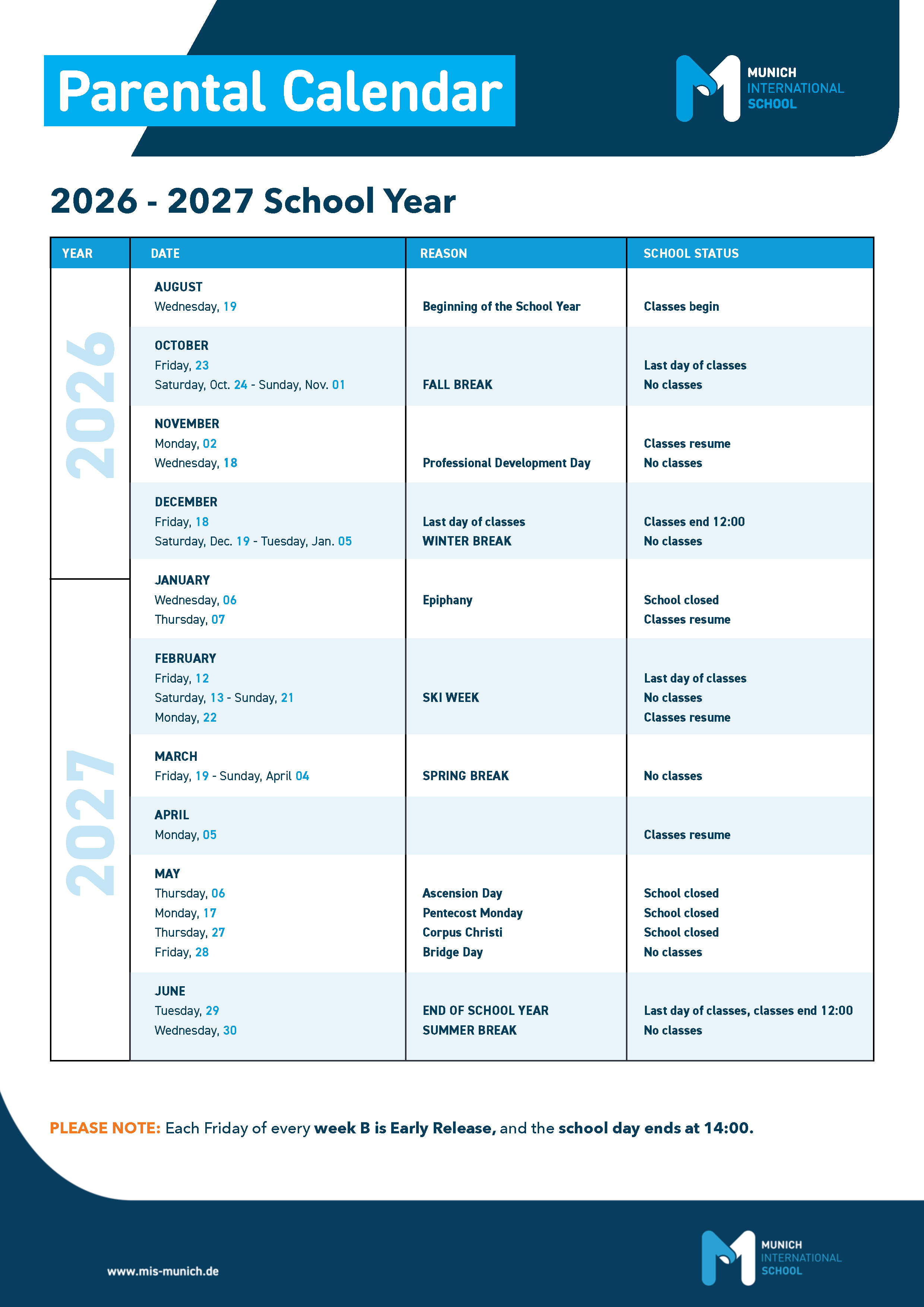 (3) The State of Bavaria’s public holiday regulations apply. MIS reserves the right to declare further days to be closing days in deviation from the holiday regulations. School days, holiday periods, celebrations and closing days are made available to the Parents/Legal Guardians in the form of the “Parental Calendar”, which can be accessed at any time under https://www.mis-munich.de/calendars.